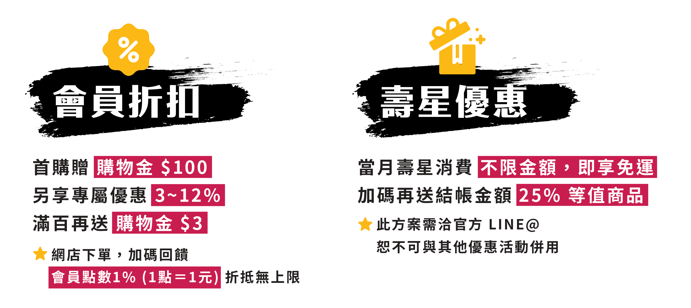 ・會員一律享滿百送 $3 購物金,及 1% 會員點數回饋,可供下次消費折抵無上限